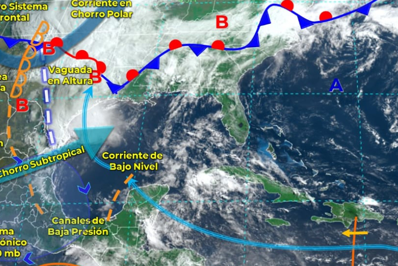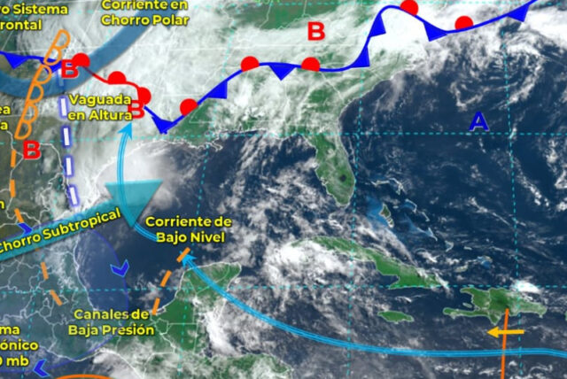 Debido al ingreso de aire marítimo tropical, en interacción con el establecimiento de un canal de bajas presiones sobre el occidente de la región y el fuerte calentamiento diurno, se presentarán condiciones de cielo medio nublado a nublado, con probabilidad de chubascos con tormentas principalmente en el centro y sur de Quintana Roo, oriente, centro, sur y noroeste de Yucatán, así como tormentas fuertes en el centro y sur de Campeche. El ambiente será caluroso a muy caluroso durante el día y cálido por la noche, con viento dominante del este-sureste de 15 a 30 km/h y rachas mayores a 40 m/h en zonas costeras.