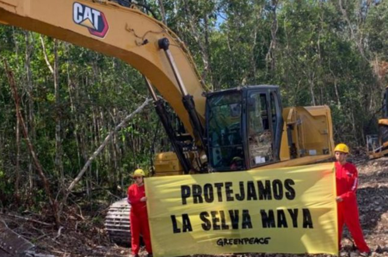 Greenpeace México se dio cita hoy temprano para colocar un salvavidas gigante en el Tramo Cinco del Tren Maya, donde a pesar de la prohibición de las autoridades judiciales, sigue la deforestación por lo que exigió la suspensión de las obras.