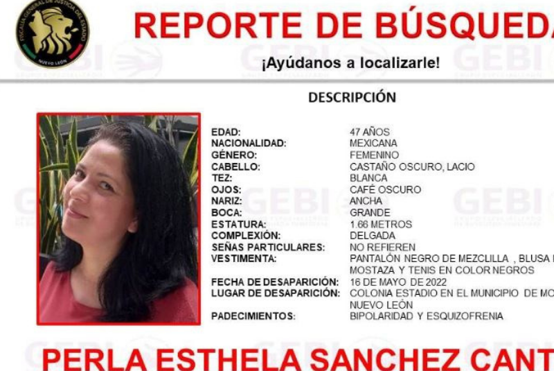 Perla Esthela Sánchez Cantú mujer de 47 años de edad que padece bipolaridad y esquizofrenia fue reportada como desaparecida.